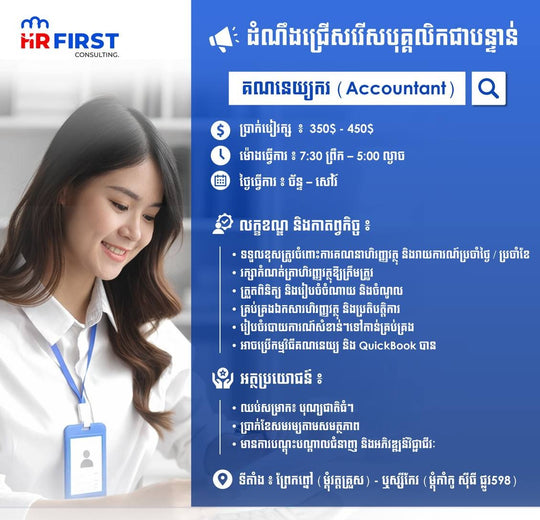 ជ្រើសរើសបុគ្គលិក៖ គណនេយ្យករ (Accountant) - ចេះប្រើ QuickBooks | ប្រាក់ខែ $350 - $450